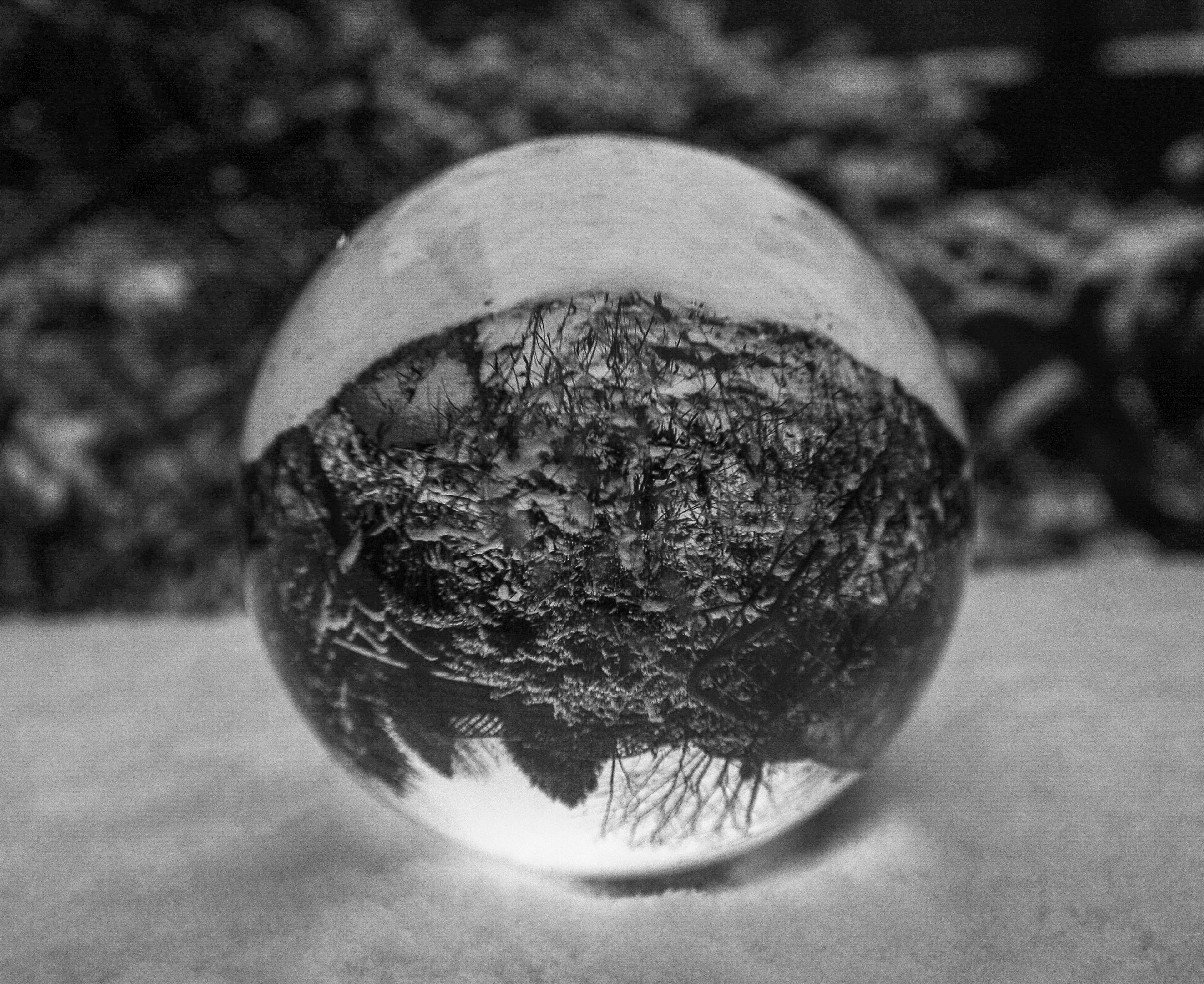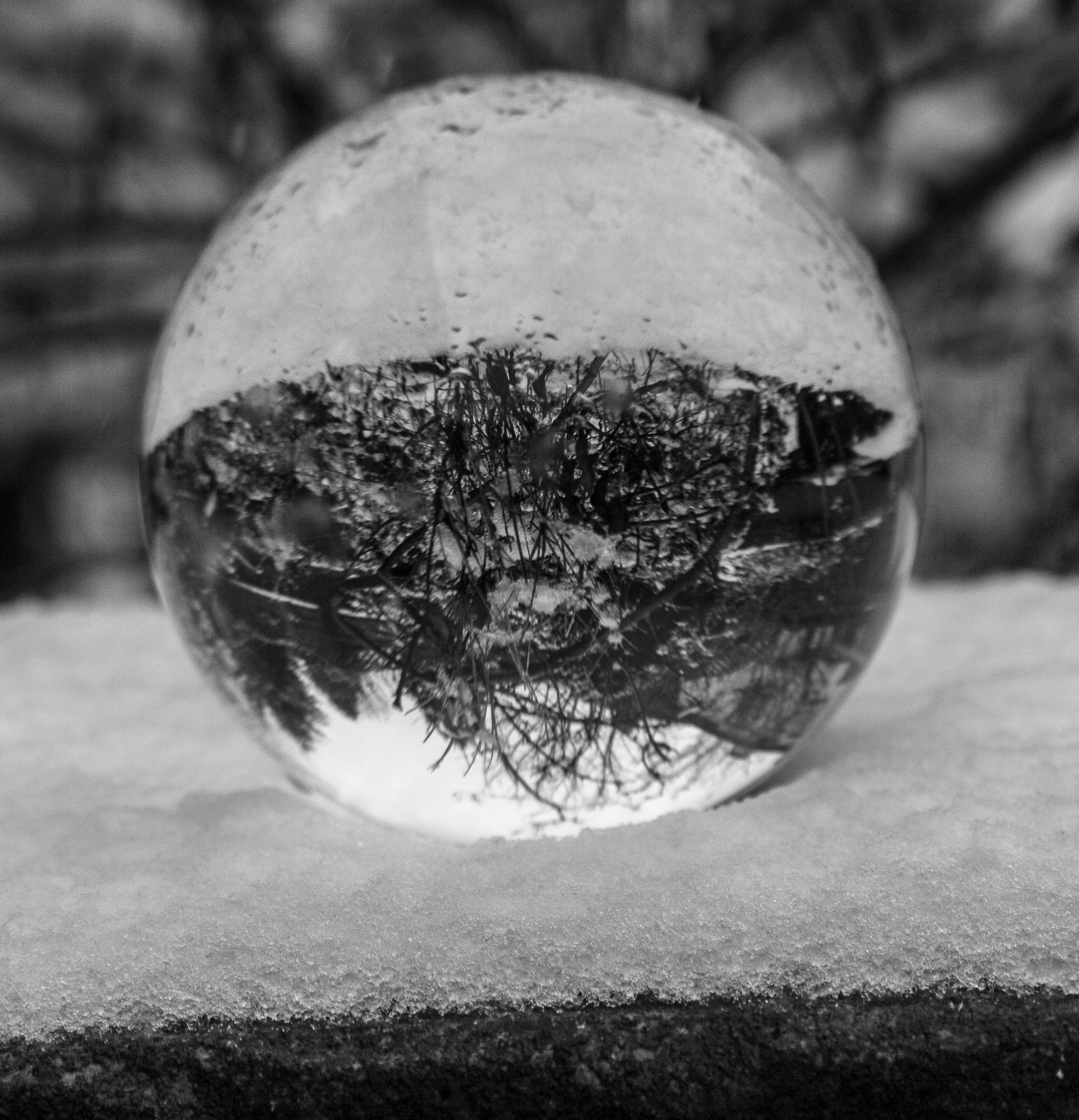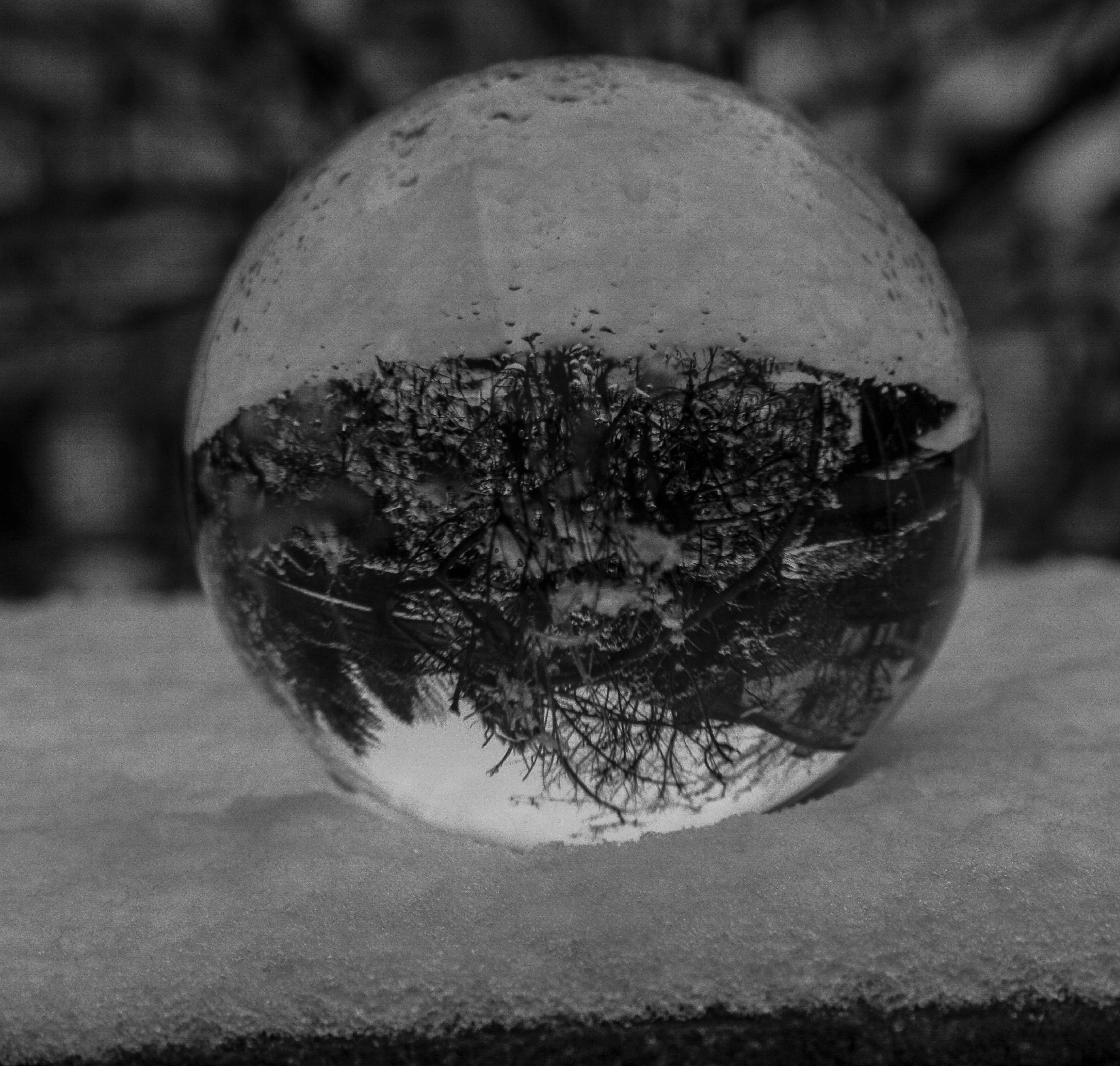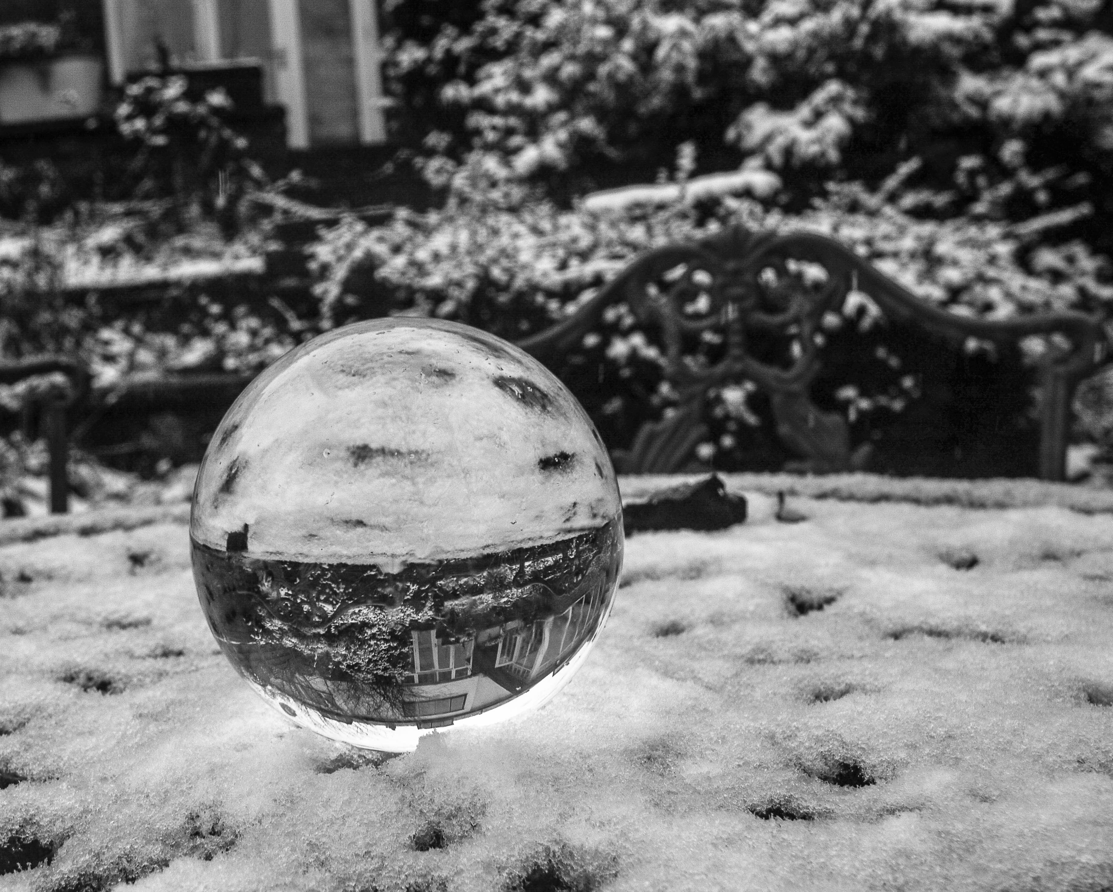 I decided my sigma 10-20mm (wide angle lens) was the best one to use for this experiment, so I placed my crystal ball on my garden wall making sure I had foliage behind and shot at ISO 100 but kept varying the aperture and shutter speed to achieve a variety of different photos. I decided that the crystal ball in the snow tended to look better in black and white, so I adjusted this in the post-processing in Lightroom. I did this by taking down the contrasts and highlights and upping the shadows and exposure and then converting my image to black and white.
