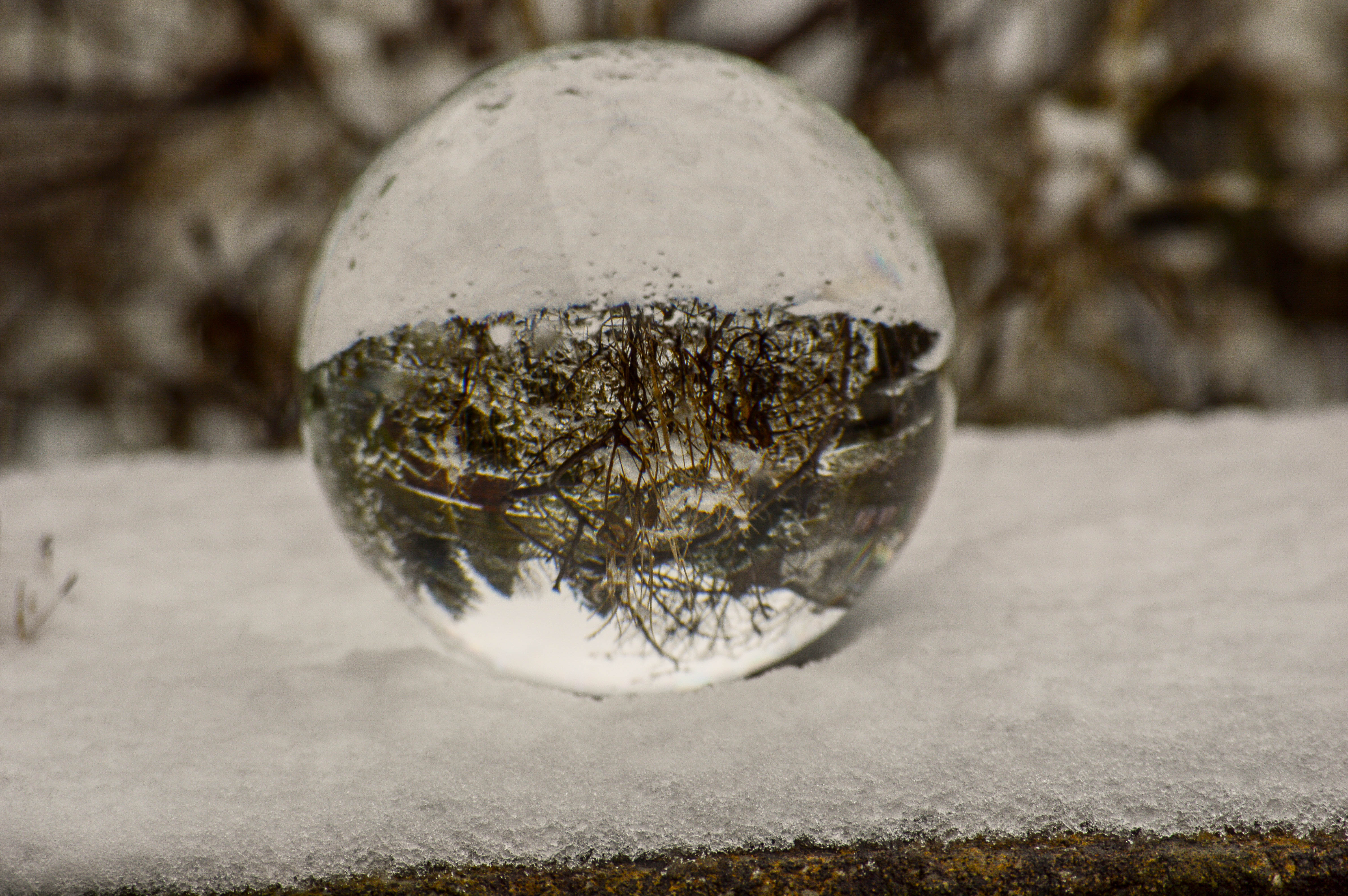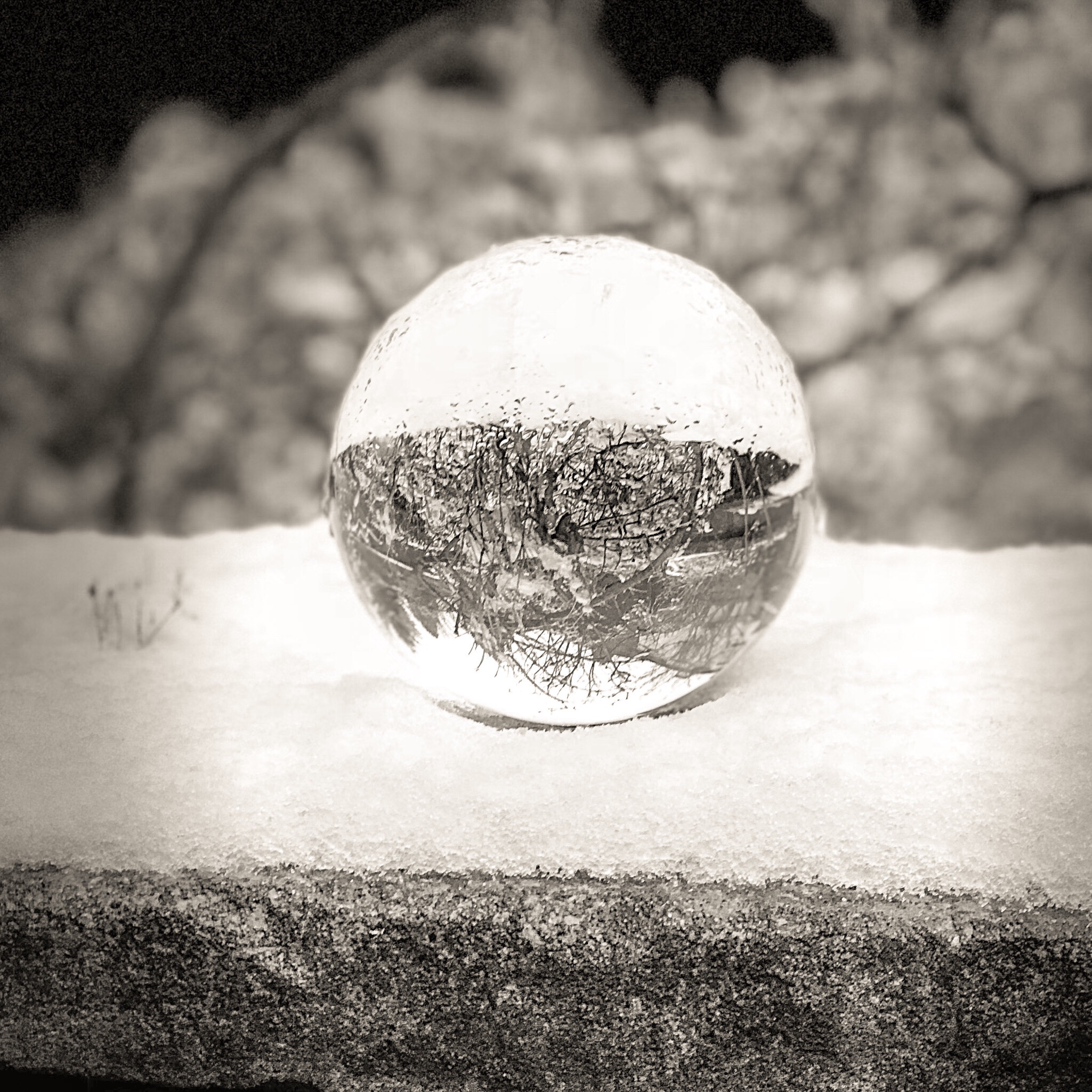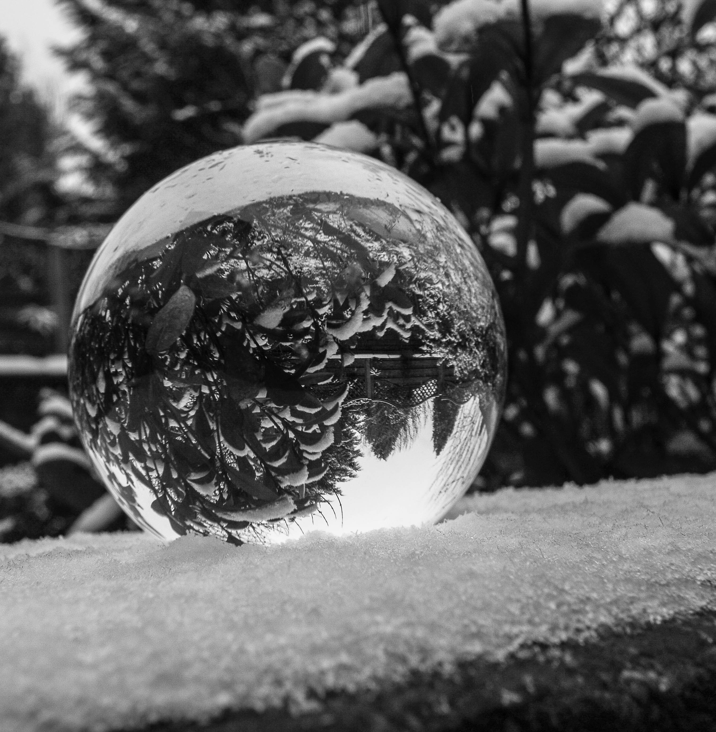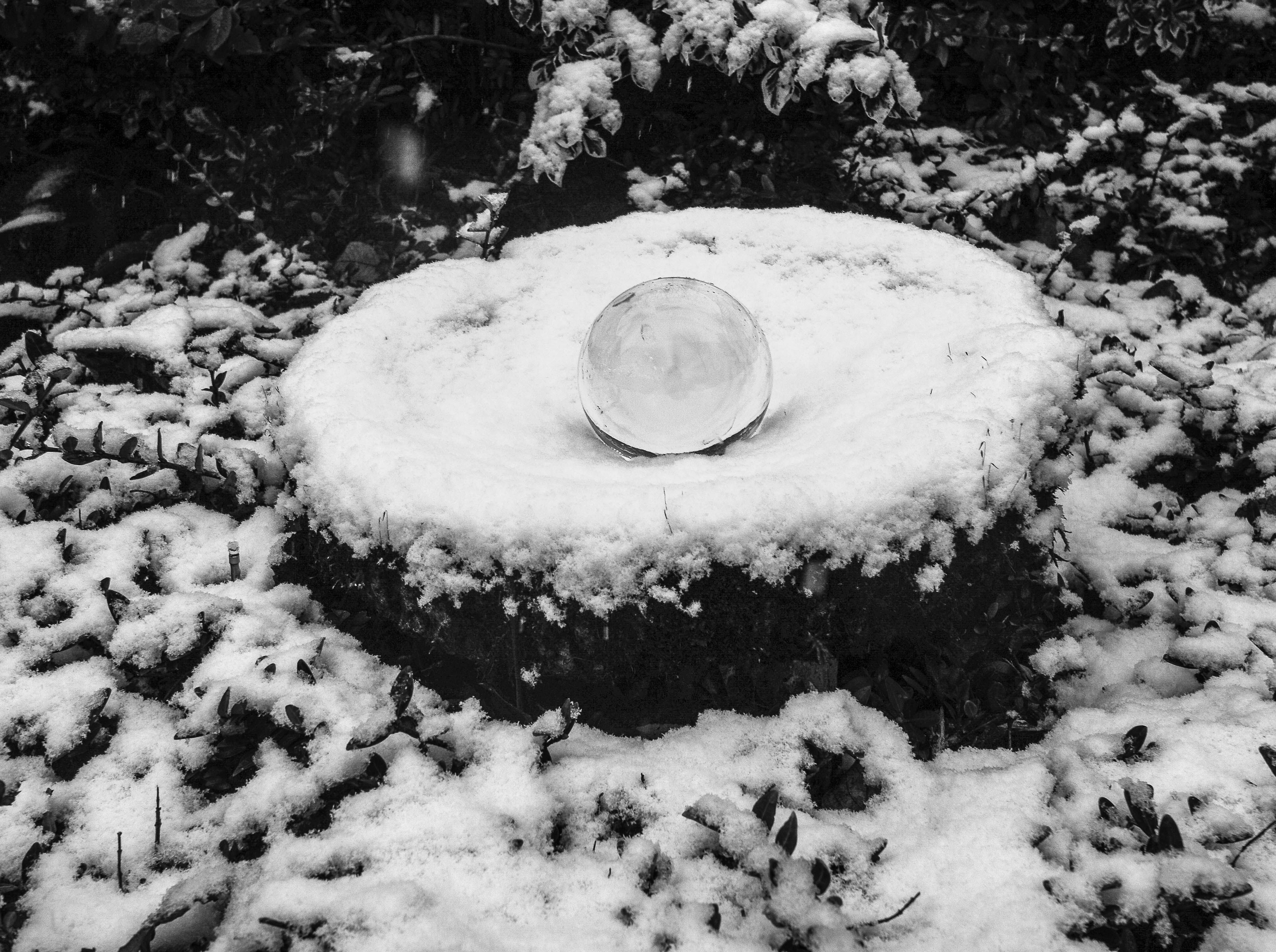 I decided my sigma 10-20mm (wide angle lens) was the best one to use for this experiment, so I placed my crystal ball on my garden wall making sure I had foliage behind and shot at ISO 100 but kept varying the aperture and shutter speed to achieve a variety of different photos. I decided that the crystal ball in the snow tended to look better in black and white, so I adjusted this in the post-processing in Lightroom. I did this by taking down the contrasts and highlights and upping the shadows and exposure and then converting my image to black and white.