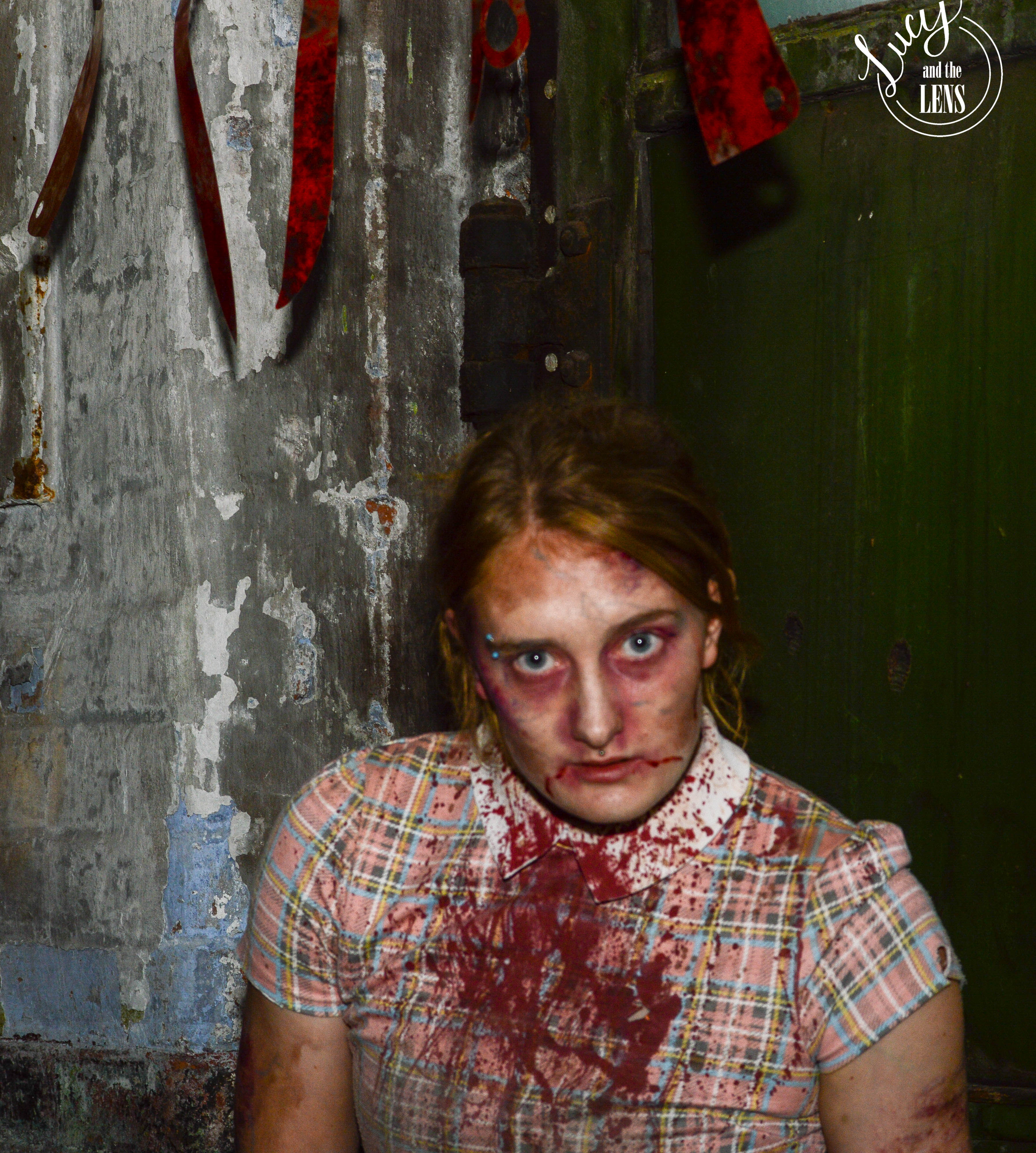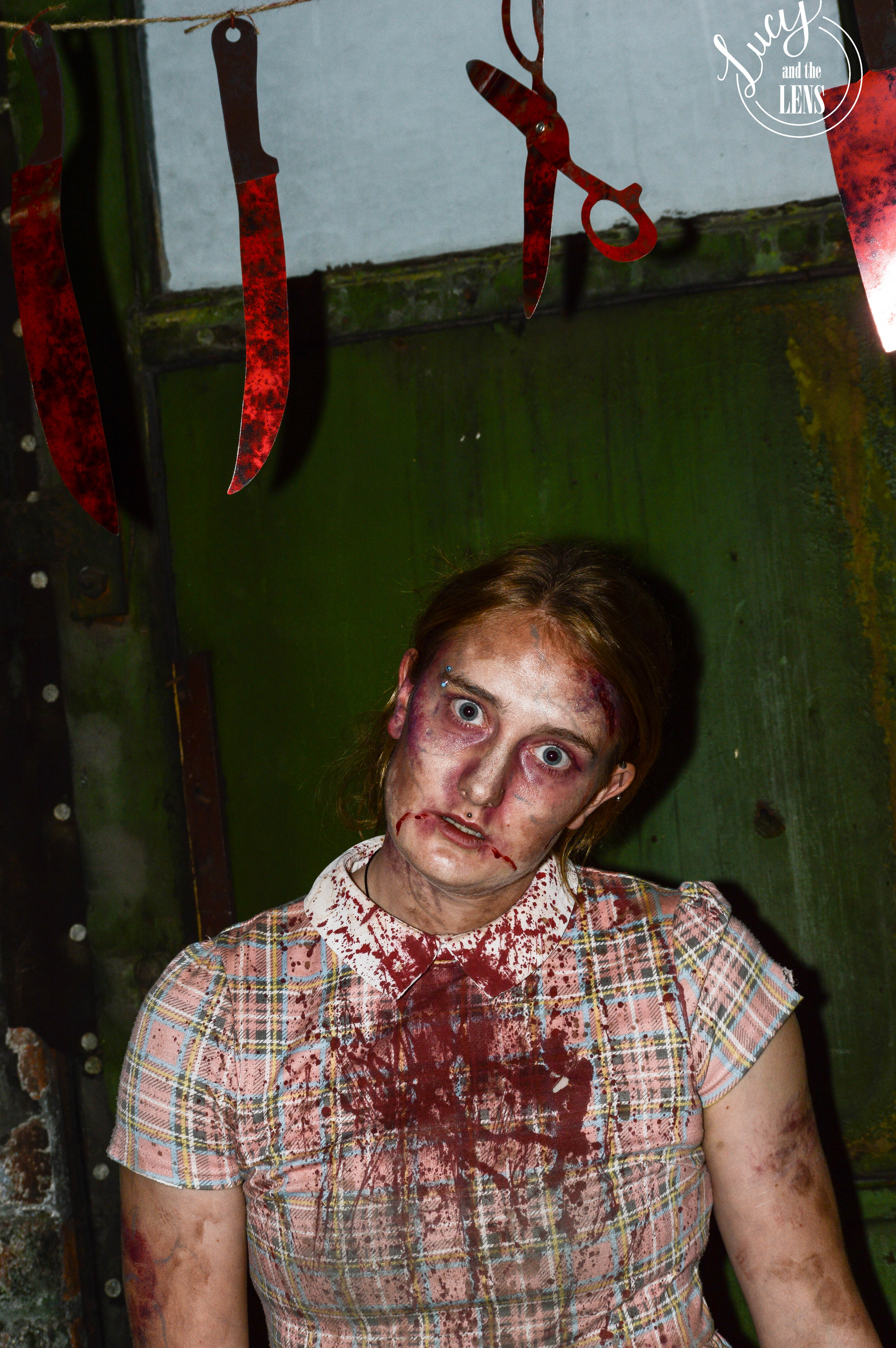 On the 13/10/2018 i went to a photography session days event at Atlas Studios where there was a mystery set which was zombies. This fits perfectly with the Halloween theme. There were also some bloody knives over a door which enhanced this. I framed her under these to add to the terror of Halloween. I also enjoyed using the strobe under the stairs as it added a dark and moody feel to the zombies. The zombies caged and trying to break out adds a conventional, zombie movie-esque horror to the images and creates a sense of escape from reality.