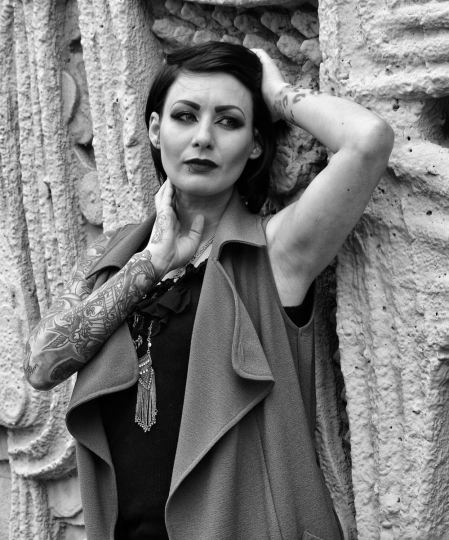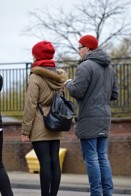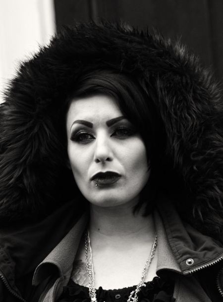 The next part of the walk consisted of some street photography and finding some stunning textured walls to shoot the tattooed model Rhi against and it was hard to take a bad shot of her. As we were in a big group it became increasingly difficult to get any one on one time but the model Rhi had this great red hood and some interesting tattoos and I had got some shots earlier in the day but I had this particular shot in mind. What I wanted was a shot of Rhi with the hood up, where she was holding it in her hands and I wanted to add the feature of the finger tattoo while looking for the perfect background to compliment her. With a little help from my photography friends I found this sign that looked like a magazine style poster that was perfect for my idea.