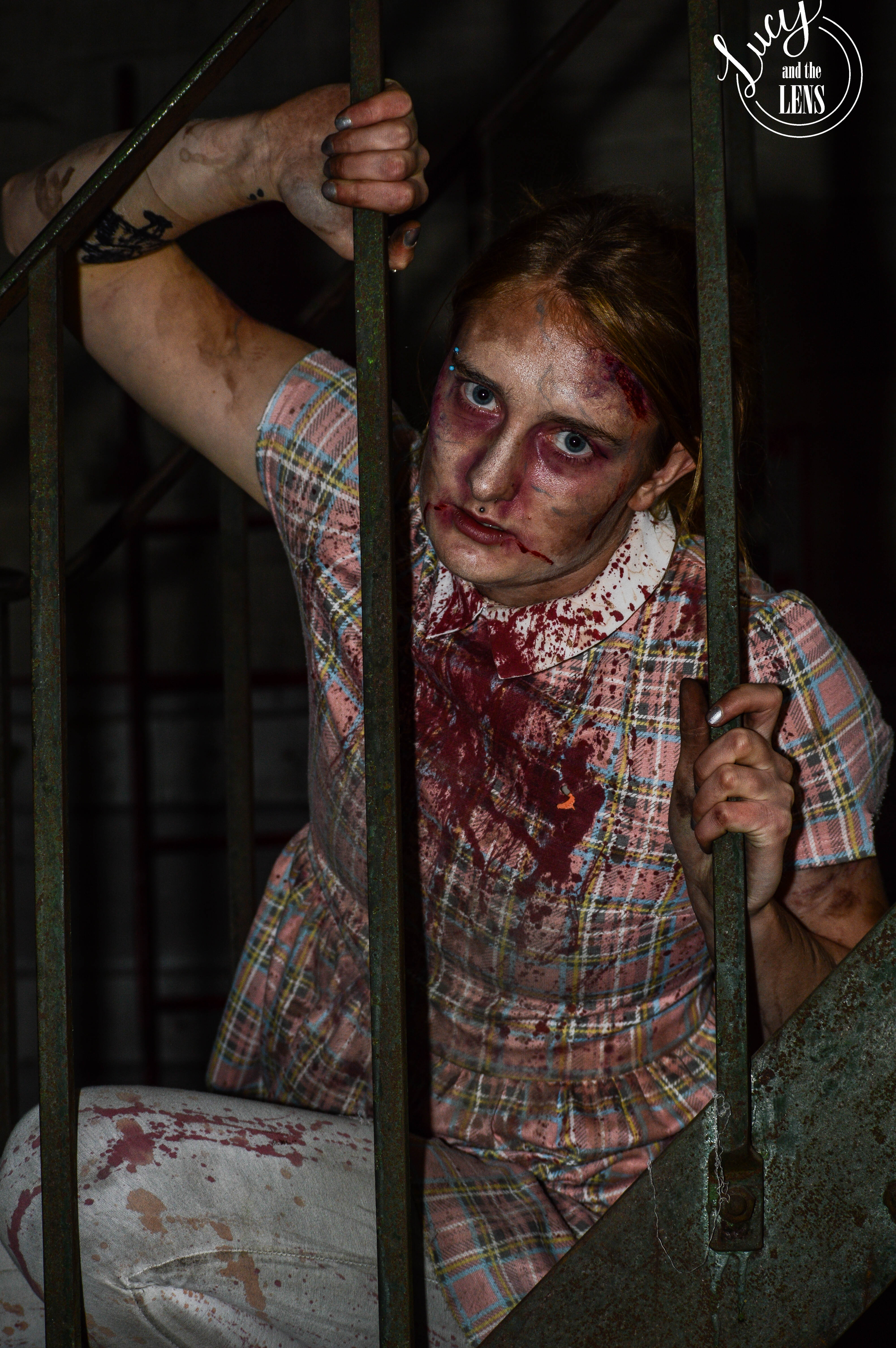 On the 13/10/2018 i went to a photography session days event at Atlas Studios where there was a mystery set which was zombies. This fits perfectly with the Halloween theme. There were also some bloody knives over a door which enhanced this. I framed her under these to add to the terror of Halloween. I also enjoyed using the strobe under the stairs as it added a dark and moody feel to the zombies. The zombies caged and trying to break out adds a conventional, zombie movie-esque horror to the images and creates a sense of escape from reality.